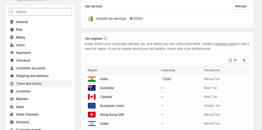 Path: Shopify Admin → Settings → Taxes and duties