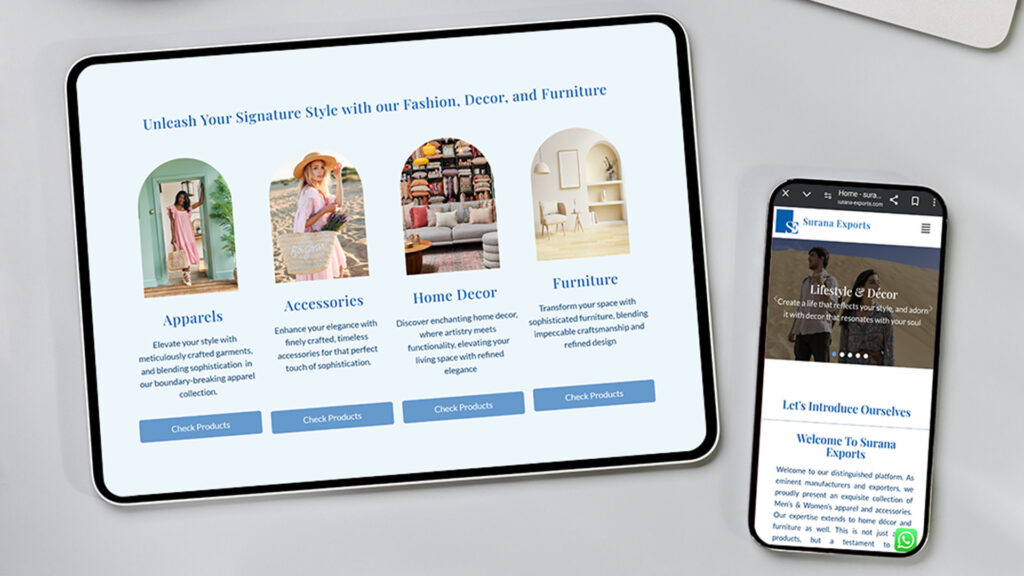 Surana Exports required a dedicated website for fashion and lifestyle to showcase their diverse product range, with an elegant, minimalist design that perfectly mirrors the sophistication, premium appeal, and timeless quality of their offerings.